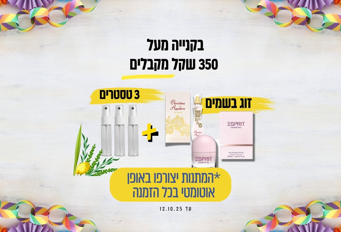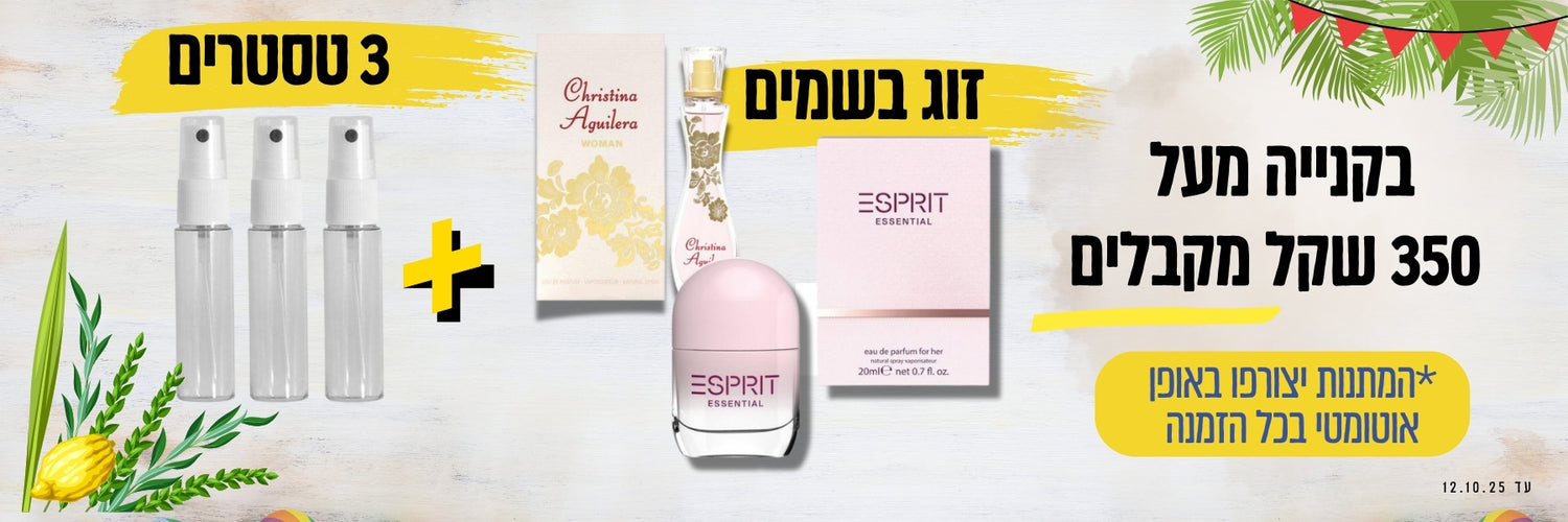 אנחנו חנות אונליין ישראלית שמכילה ליין של אלפי מוצרים מתחום הבישום, האופנה והטיפוח ממגוון מותגים בינלאומיים. לניווט קל חפשו את המוצרים האהובים עליכם בבר החיפוש בראש הדף או הקליקו על הקטגוריה הרצוייה בתפריט כדי לראות את הקולקציה המלאה. המשלוחים שלנו מגיעים לכל רחבי הארץ והם אפילו חינם בכל רכישה מעל ₪300.
