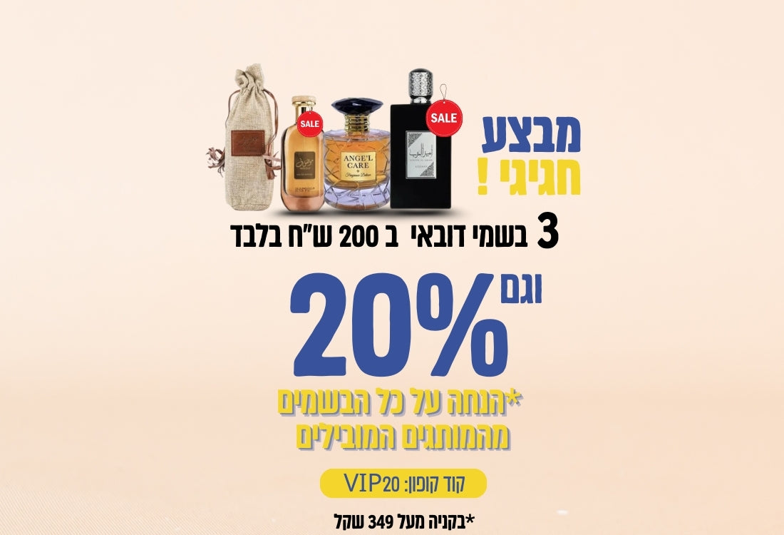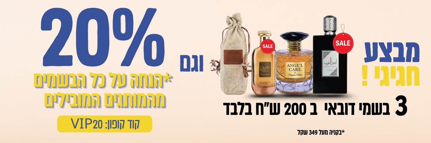 אנחנו חנות אונליין ישראלית שמכילה ליין של אלפי מוצרים מתחום הבישום, האופנה והטיפוח ממגוון מותגים בינלאומיים. לניווט קל חפשו את המוצרים האהובים עליכם בבר החיפוש בראש הדף או הקליקו על הקטגוריה הרצוייה בתפריט כדי לראות את הקולקציה המלאה. המשלוחים שלנו מגיעים לכל רחבי הארץ והם אפילו חינם בכל רכישה מעל ₪300.